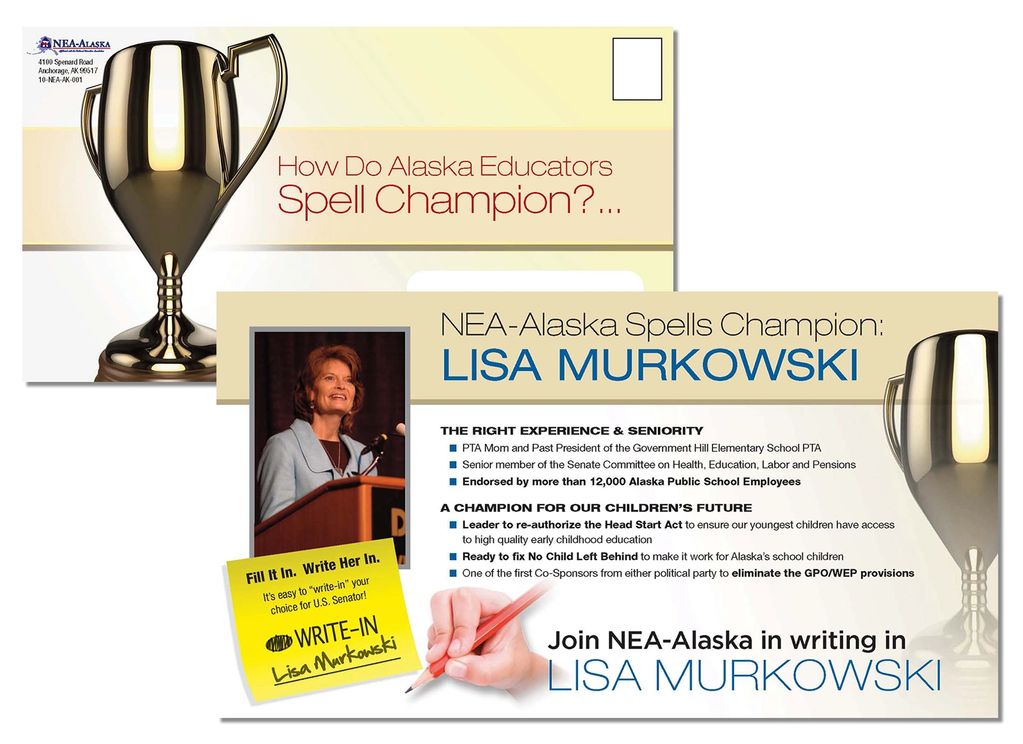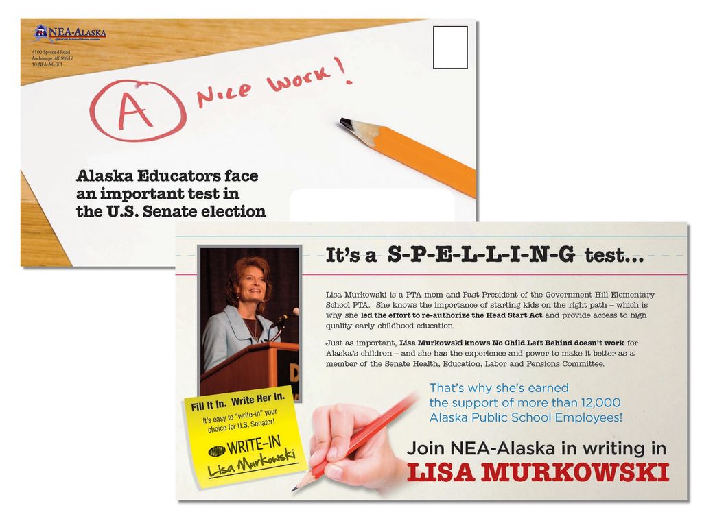 Direct mail focused on proving Murkowski's effectiveness on issues important to NEA-AK members as well as her bipartisan bona fides. Final communications provided NEA-AK members "permission" to vote for Murkowski by having other members like them deliver the message. Every mailer included a simple graphic mimicking the ballot to teach members how to write-in their vote.